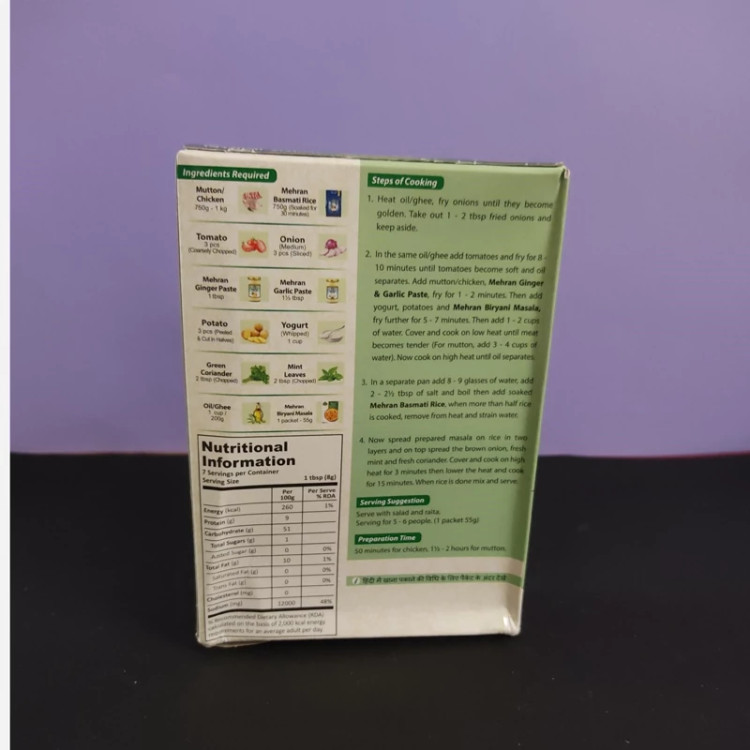 ماسالای بریانی مهران. 55 گرمی. ساخت هند ماسالای بریانی مهران ادویه مخصوص گوشت و برنج سنتی طرز تهیه بریانی به سبک هند طرز تهیه بریانی(برای 6 نفر) : 2 عدد پیاز متوسط را خلالی خورد کنید و در روغن سرخ کنید سپس 3 عدد گوجه فرنگی را نگینی خورد کرده و به پیاز اضافه کنید و 10 دقیقه تفت دهید تا گوجه فرنگی له شود و روغن آن جدا شود حالا 750 گرم گوشت یا مرغ اضافه کنید وتقت دهید سپس 1 قاشق غذاخوری عصاره زنجبیل و عصاره سیر اضافه کنید .و 2 دقیقه تفت دهید سپس ماست 1:پیمانه و سیب زمینی پوست کنده 2 عدد از وسط نصف شده ،و ادویه ماسالای مهران را اضاقه کنید .و 7 دقیقه تفت دهید . سپس آب اضافه کنید ( اگر مرغ استفاده کردین 2 پیمانه آب .و اگر گوشت استفاده کردین حدود 4 پیمانه آب اضافه کنید ) درب ظرف را ببندید با شعله کم تا گوشت بپزید برنج را در قابلمه جدا بپزید و آبکش کنیدسپس گوشت آماده شده را لابلای برنج گذاشته و روی هر لایه برگ نعنای خورد شده ( 2 قاشق غذاخوری )و گشنیز خورد شده (2 قاشق غذاخوری) پخش کنید و درب قابلمه را ببندیدو با حرارت کم بگذارید دم بکشد